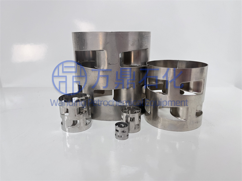鮑爾環是基于拉西環的不足之處的改進產物。其結構構造是在拉西環的側壁上開出一排或兩排長方形的帶有內伸舌片的矩形窗孔,窗孔的內彎葉片在環中心幾乎相搭,一般開孔的總面積約為整個環面積的35%。改進后的結構使環內空間以及環內表面利用率大幅提高,氣相湍動得以增加,氣液分布狀態得以改善,緩解了溝流與壁流現象。