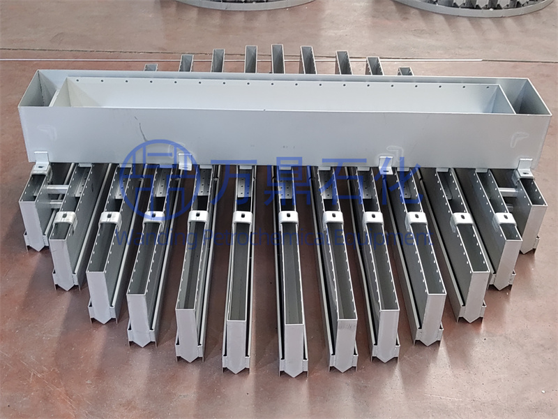 由主槽(一級槽)及分槽(二級槽)組成,主槽置于分槽之上。回流液和加料液體由置于主槽上方的進料管進入主槽中,再由主槽按比例分配到各分槽中。主槽與分槽的結構尺寸由液體流率、塔件以及對分布質量的要求而定。二級槽式分布器結構簡單,易于從人孔中進塔組裝;升氣通道均勻,自由截面積大。其缺點是占有塔空間大,且各分槽液位不易達到完全一致。此種結構形式多用于直徑大于1m的塔中。