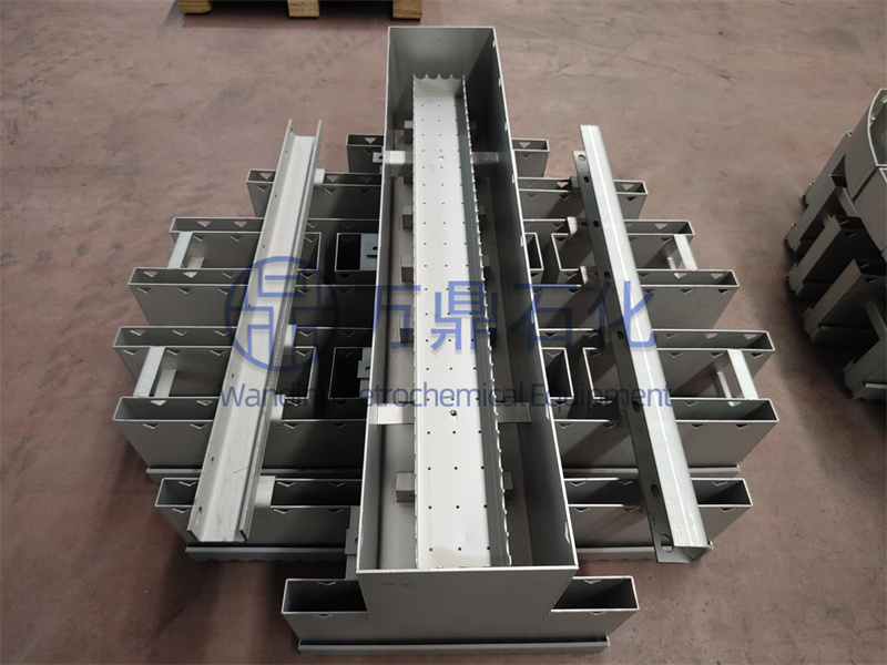 主槽為矩形截面的敞開式結構,其長度由塔徑及分槽尺寸而定,高度取決于操作彈性,一般為200?300mm。它的作用是將液體穩定均勻地分配到各分槽,為此,主槽底部要設布液裝置,主槽內部要有防沖裝置,穩流裝置,外部要有定位與固定裝置。