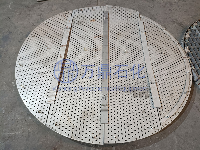 操作過程中,氣相高速吹過塔板,將液相吹散成細(xì)小的液滴。氣相作為連續(xù)相,液相作為分散相。網(wǎng)孔塔板上還裝有傾斜的擋沫板,它采用與塔板結(jié)構(gòu)相同的網(wǎng)孔板,但斜孔的開口寬度為6~8 mm。擋沫板與水平方向成10~60°,其上開孔與塔板上的斜孔方向成90°,可將噴射的液滴擋下來,從而**降低了塔板的霧沫夾帶。同時(shí),擋沫板本身也是一個(gè)**的傳質(zhì)元件,這樣充分利用了塔板的空間。