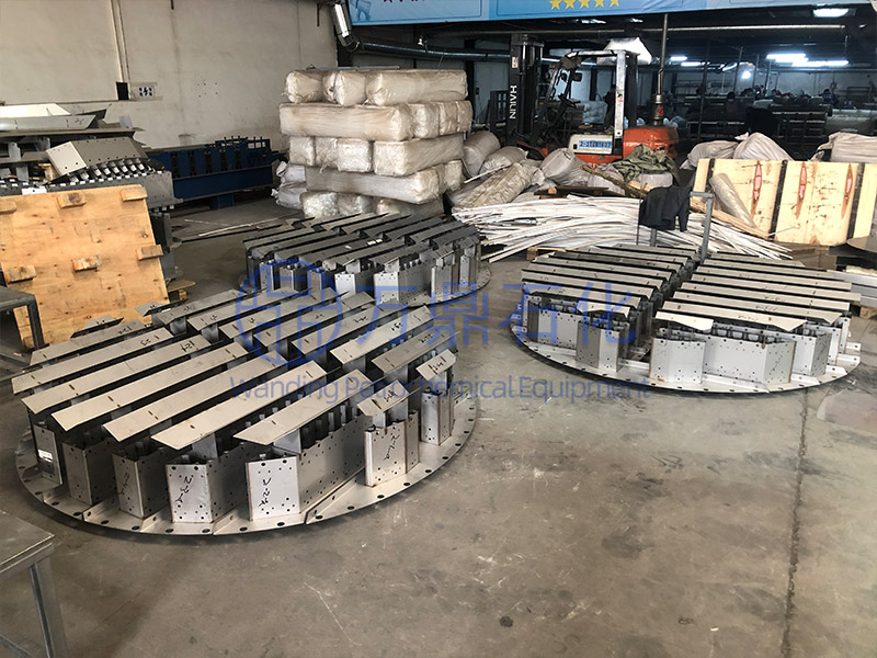 盤式分布器與槽式分布器相比,由于它的液面較低占用空間小,且布液孔處于同一液面高度(槽式分布器難以達到與各槽液面相同),故液體分布較均勻。它的**缺點是用作再分布器時,難以達到濃度混合,而且液面不能過高,否則造成漏液,故布液孔一般開在底板上。此外,布液孔的布置不如槽式分布器靈活。在安裝位置上,盤式液體分布器要有足夠的氣體釋放空間,要求安置在距填料上表面150?300mm處;而槽式分布器則要求放置于填料定位器上,一般距填料表面50mm。